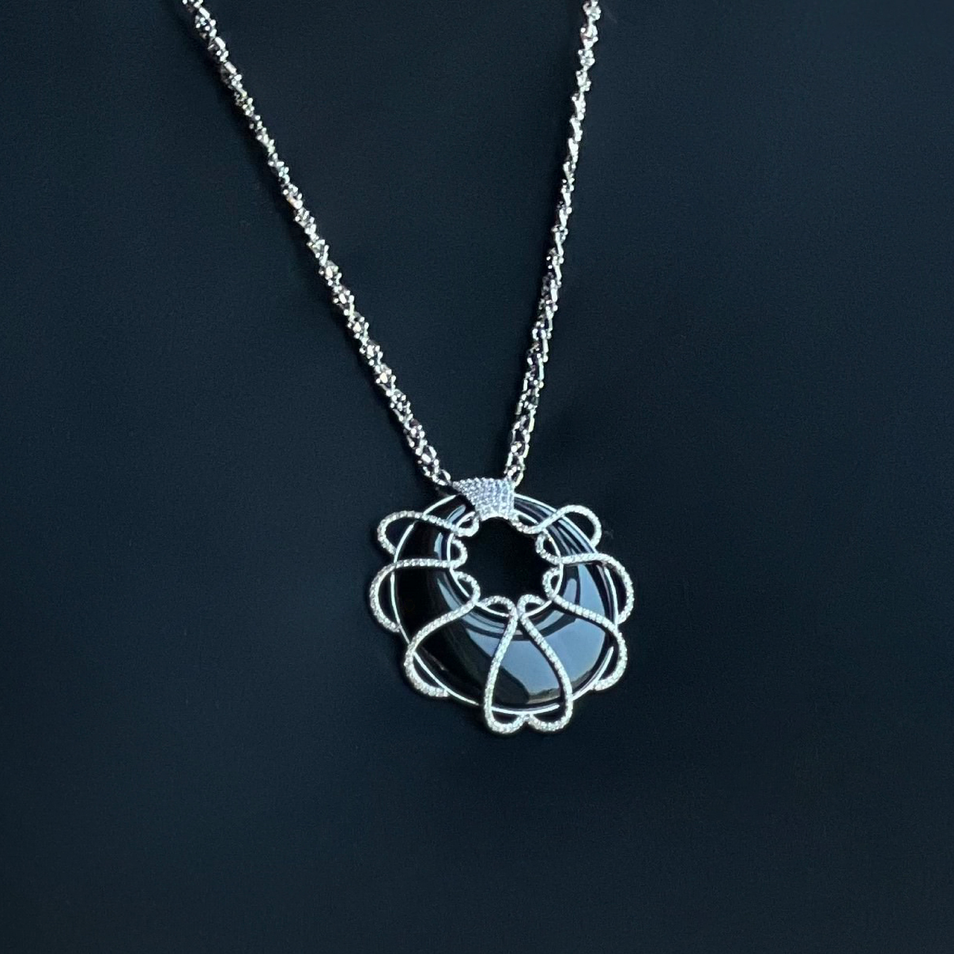 A vision emerging from the depths. Inspired by the movement of the ocean and the graceful dance of octopus tentacles beneath dim light, Dance of the Dark Sea captures fluidity in form and brilliance. The black onyx center mirrors the stillness of the deep, while 248 natural diamonds trace its curves like shimmering reflections on moving water.