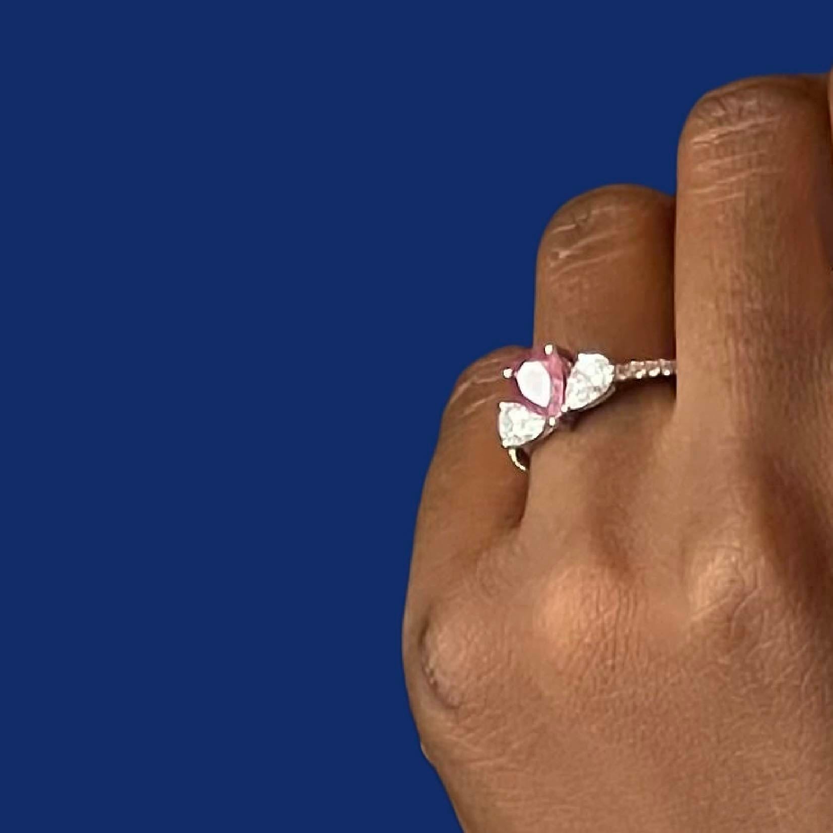 A fleeting emotion, captured in light.At its heart rests a pink tourmaline delicate yet deliberate framed by diamonds that trace half the band in quiet brilliance.